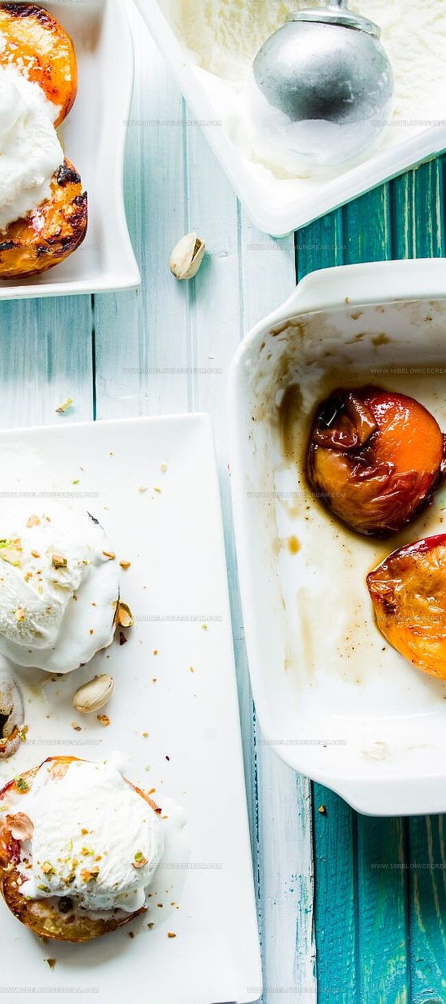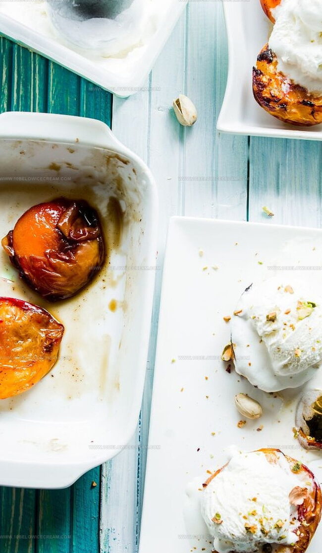 Transfer the warm, glistening peaches to serving plates and crown with a scoop of cold vanilla ice cream for a delightful temperature contrast.