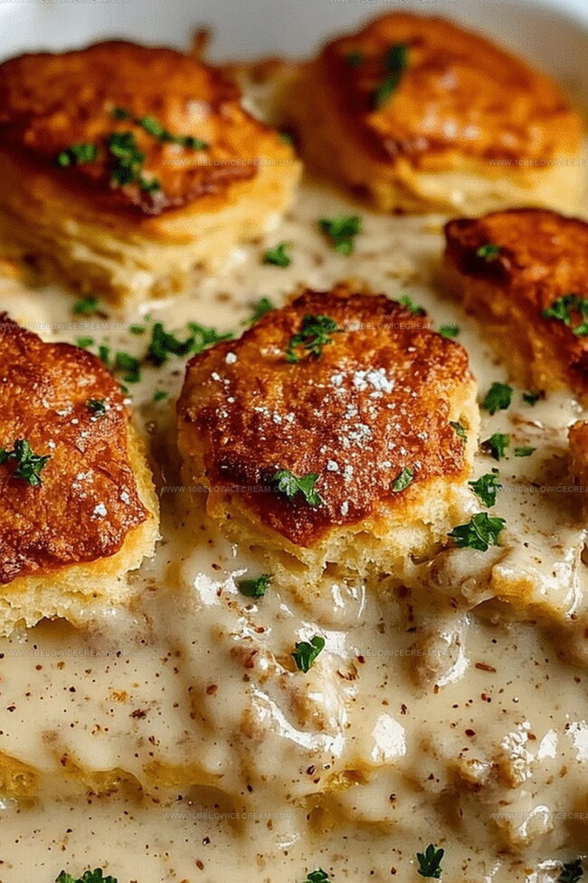 Pillowy biscuit pieces soak up rich, savory gravy, delivering a satisfying bite every time.
