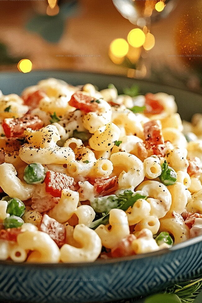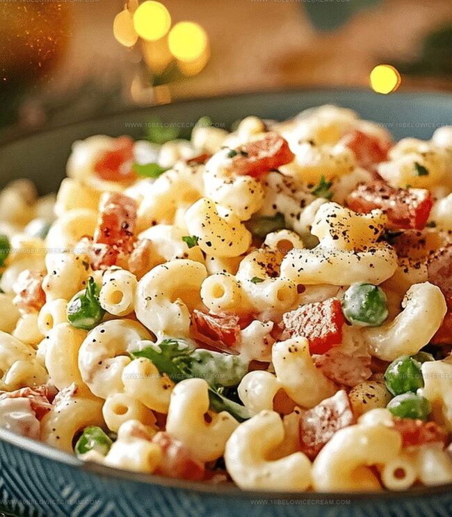 Crisp bacon bits dance among creamy pasta waves, creating a nostalgic comfort dish.