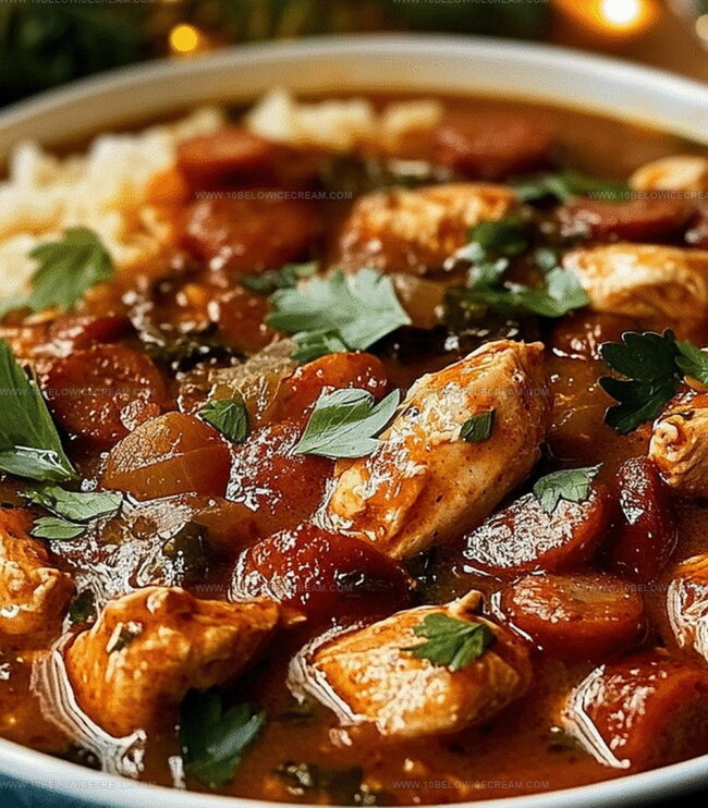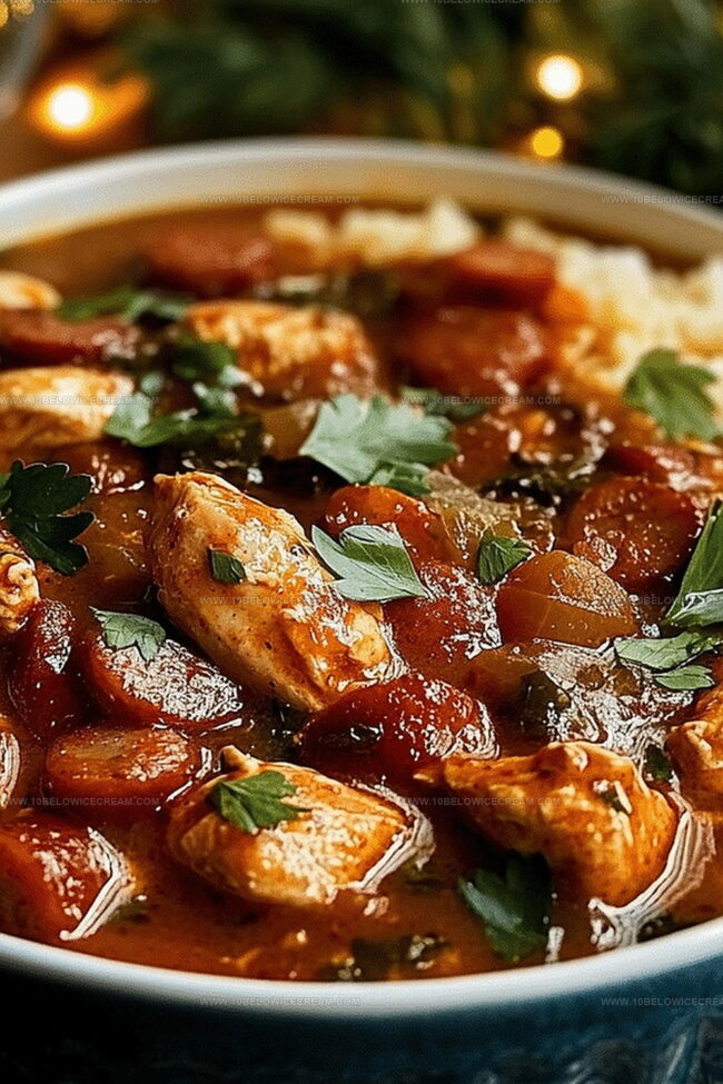 Robust andouille sausage mingles with succulent chicken, simmering in a dark, complex roux that tells a story of cultural fusion.