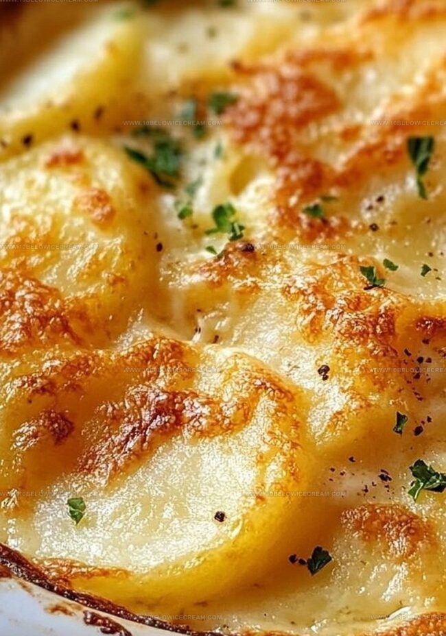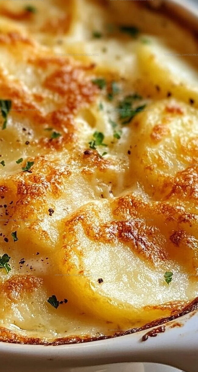 Layers of thinly sliced potatoes nestle between rich, velvety cheese sauce.