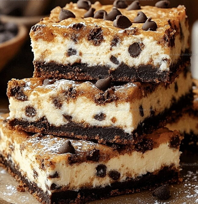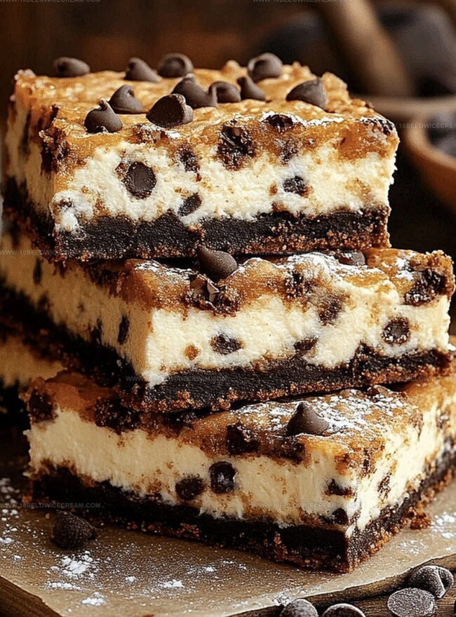 Sweet chocolate chip bars hide a creamy cheesecake surprise, promising pure indulgence in each delightful bite. Layers of rich chocolate and tangy cream cheese create a dessert that beckons you to savor every irresistible morsel.