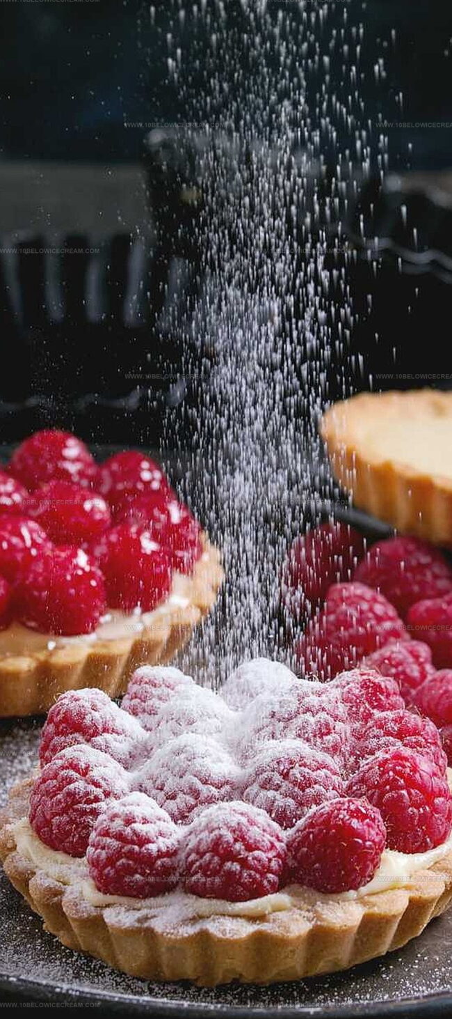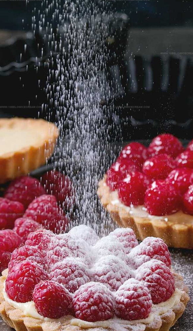 Arrange fresh raspberries on top of the tarts and brush with the strained jam glaze for a professional, appetizing presentation.