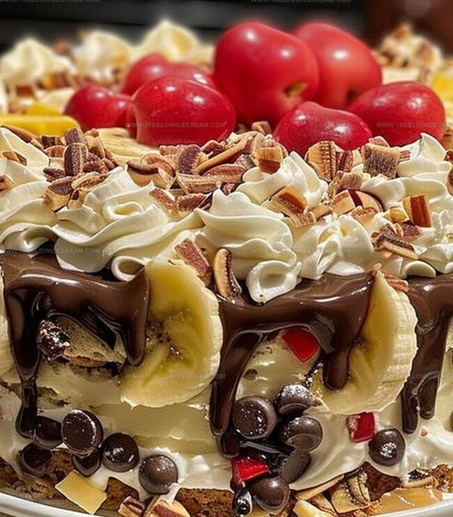 Sprinkle chopped walnuts across the top for a delightful crunch. Dot the surface with bright red maraschino cherries for a classic banana split look.