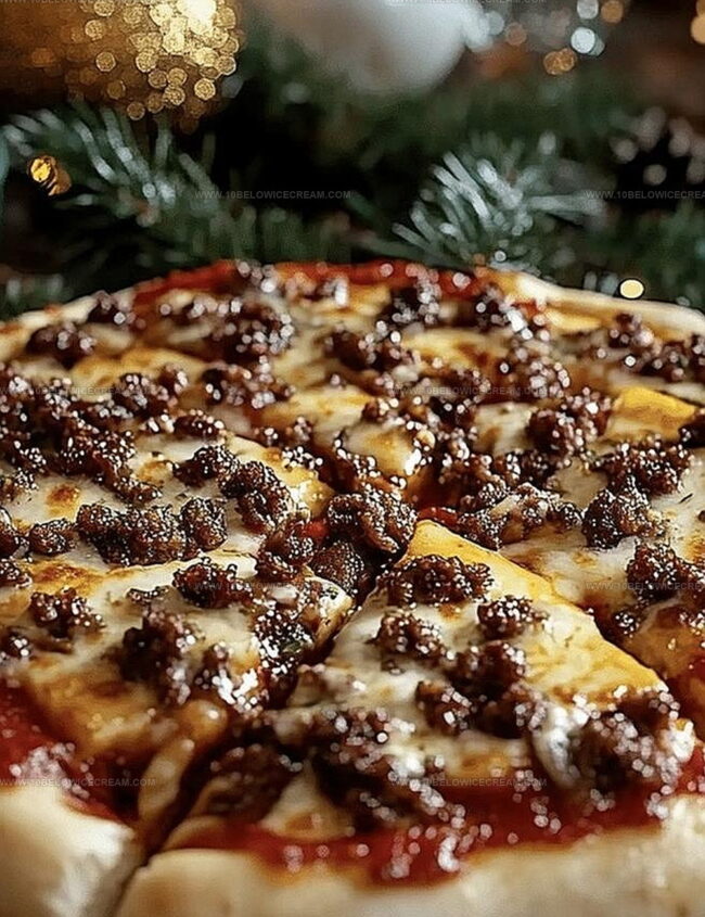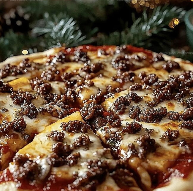 - Slice into wedges and serve hot, revealing the layers of melted cheese, seasoned beef, and classic pizza toppings.