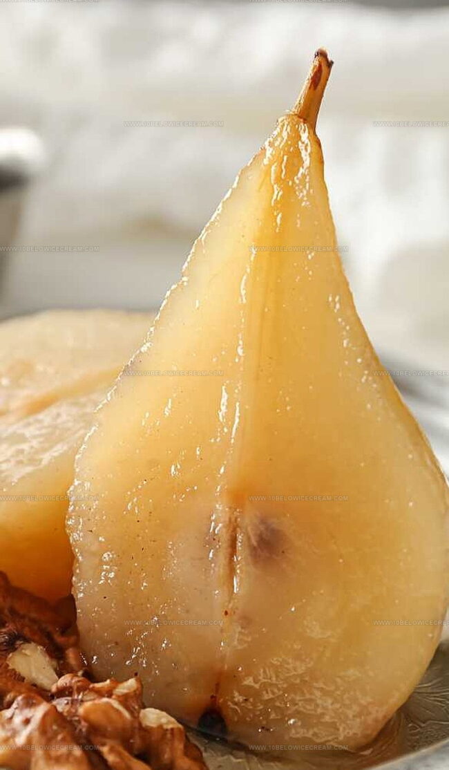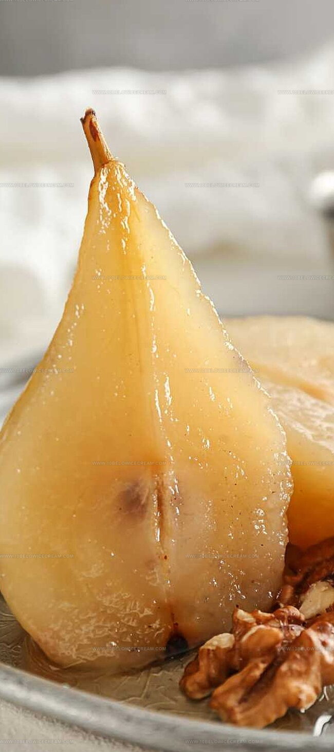 Delicate poached pears shimmer like culinary jewels waiting to captivate your dessert dreams.