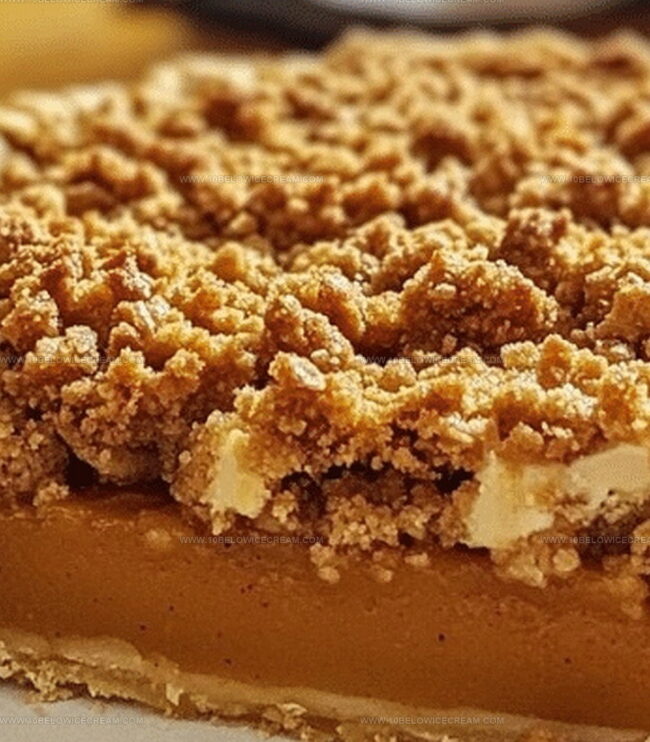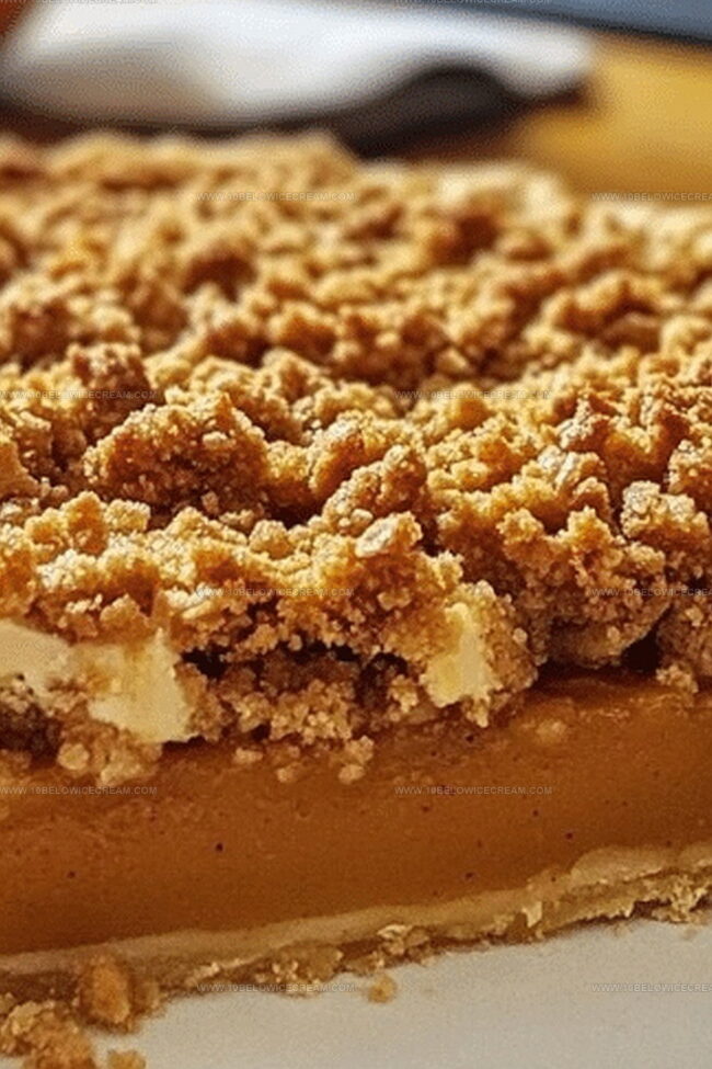 Layers of crumbly, golden topping promise a delightful contrast to the silky smooth pumpkin filling.