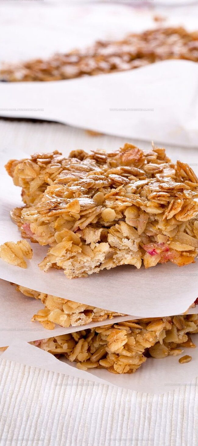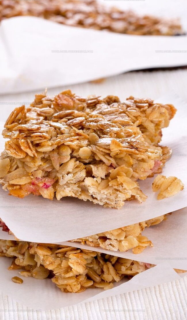 Tart rhubarb ribbons weave through buttery oat layers, offering unexpected bursts of flavor.