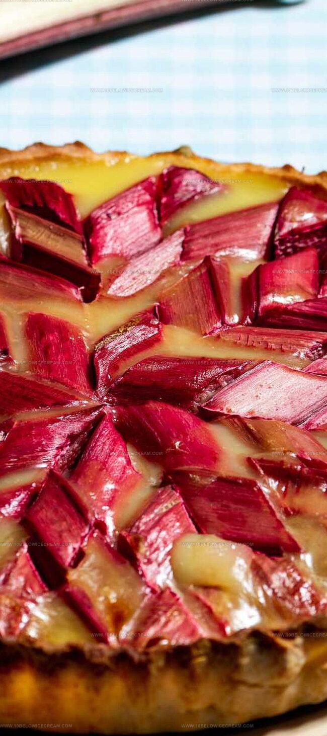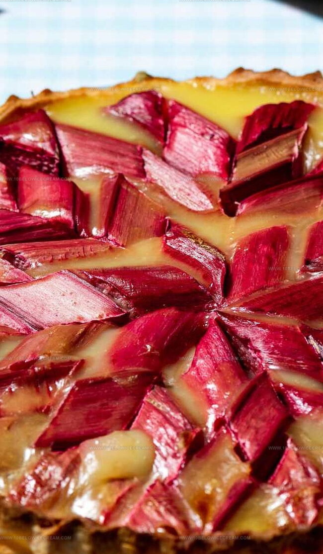 - Place the tart in a preheated oven at 180°C (350°F) and bake for 35-40 minutes, or until the crust turns golden brown and the rhubarb becomes tender and bubbling.