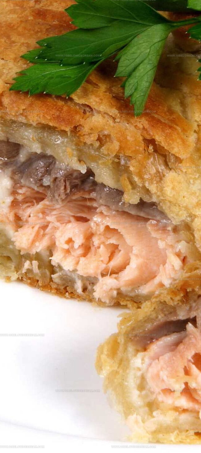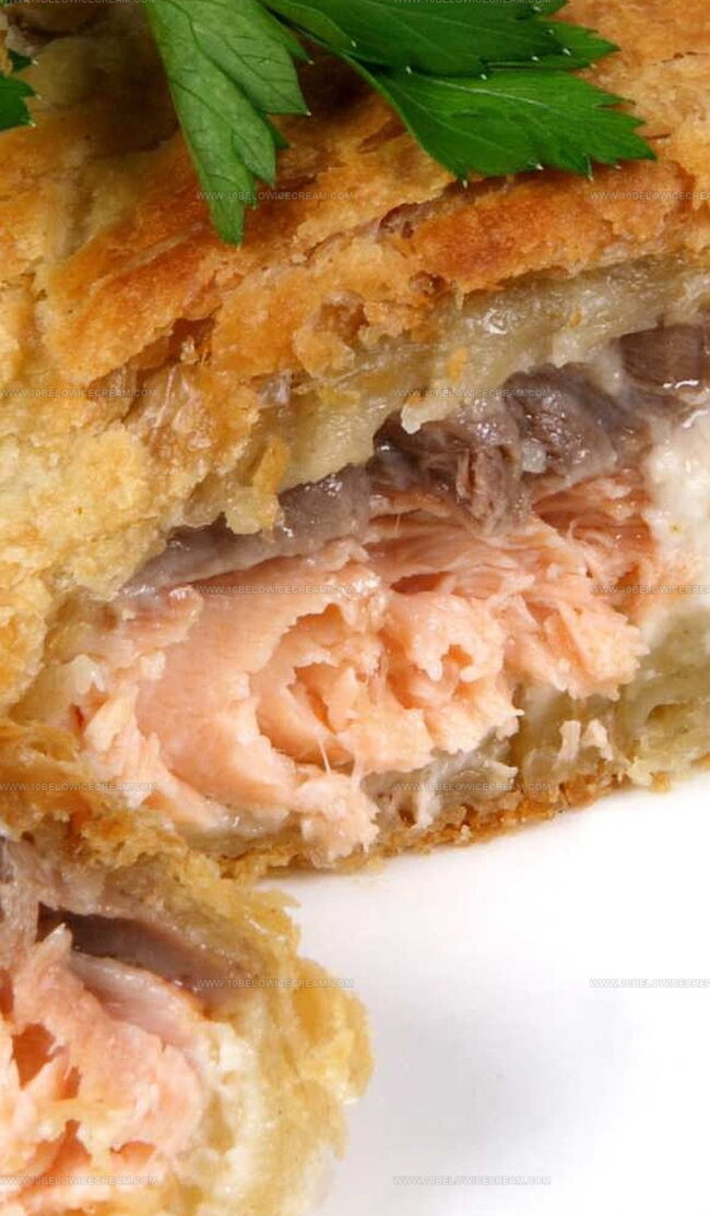 Rich salmon nestles between delicate puff pastry, creating a luxurious main course.