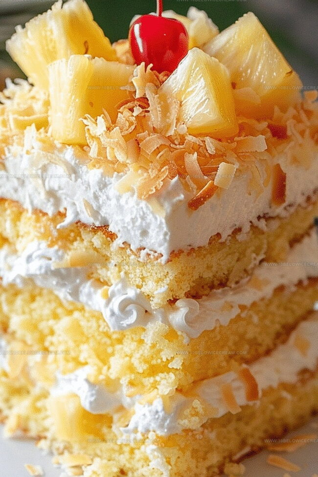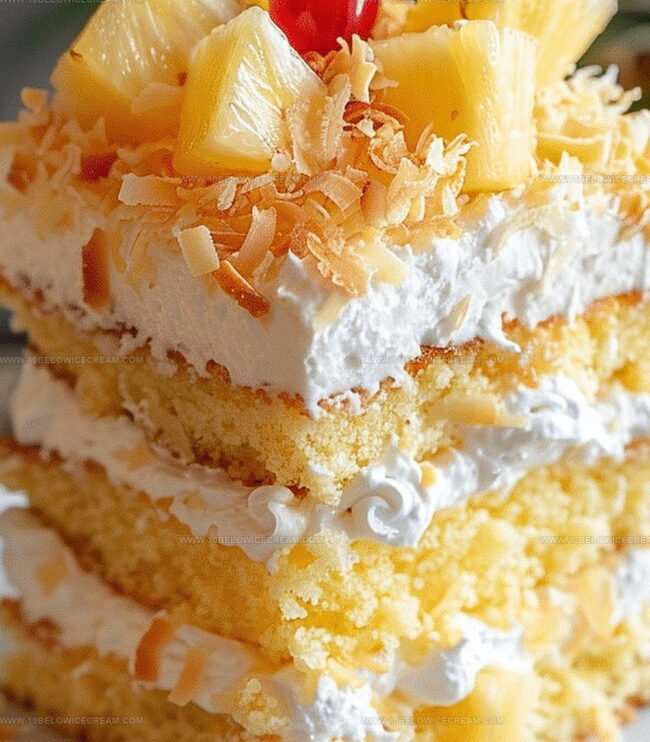 - Optional: Decorate cake top with fresh pineapple slices, maraschino cherries, and toasted coconut flakes.