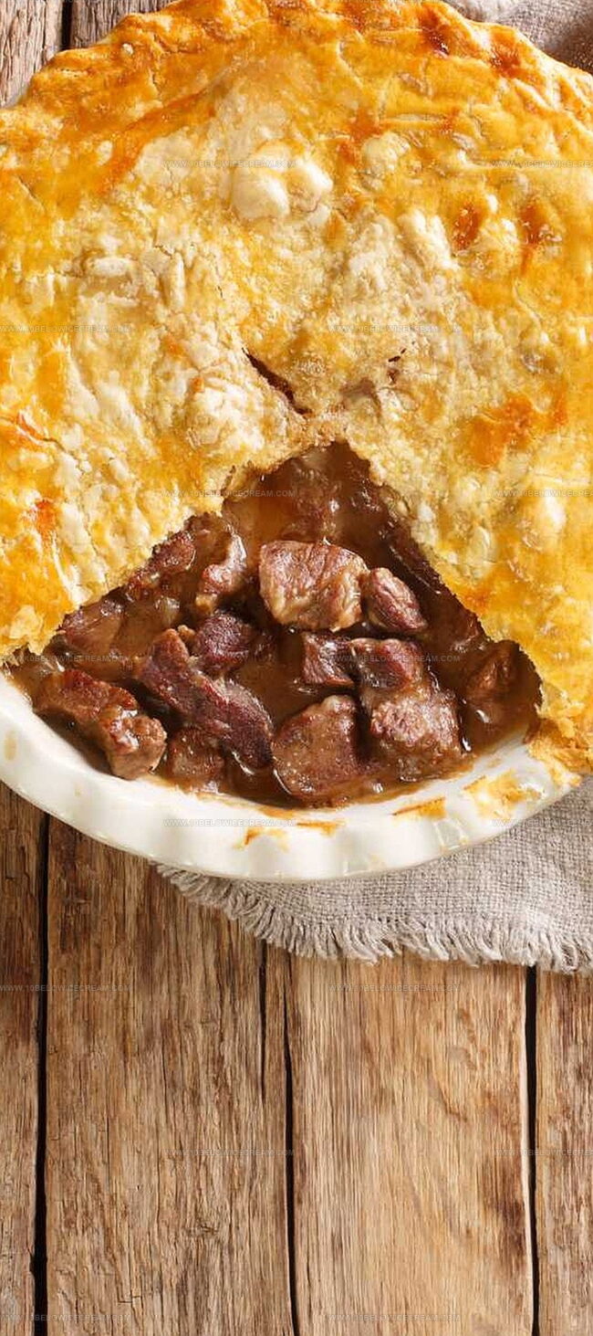 Hearty “steak and mushroom pie” brings British comfort cuisine straight to dinner tables with rich, savory flavors. Flaky pastry and tender meat meld into a rustic dish that welcomes hungry diners for a satisfying meal.