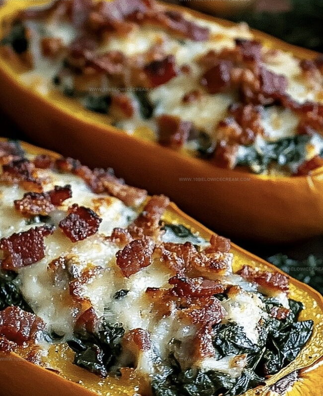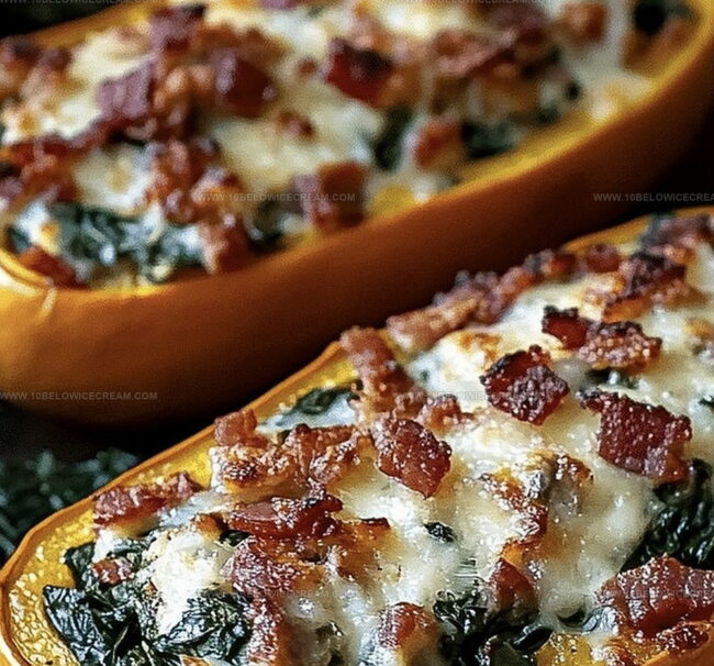Savory butternut squash stuffed with crispy bacon, vibrant spinach, and melted cheese promises a delightful culinary adventure.
