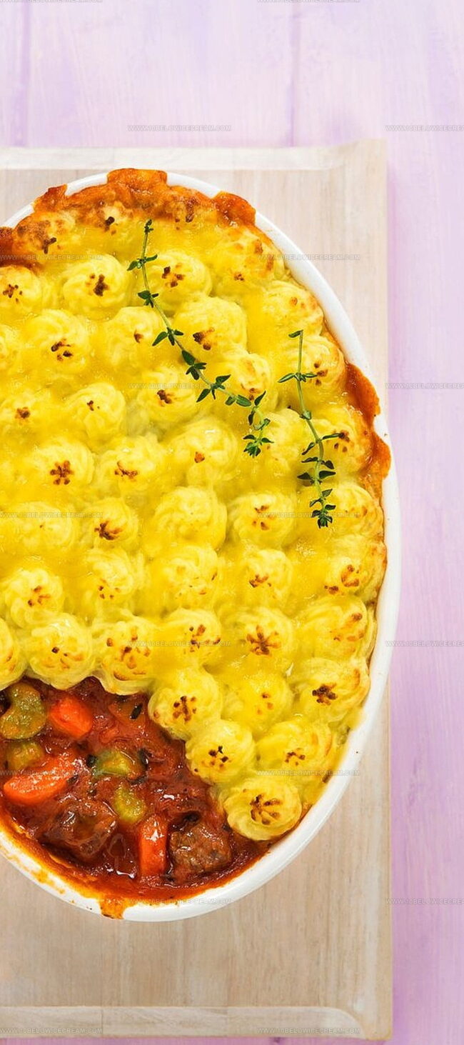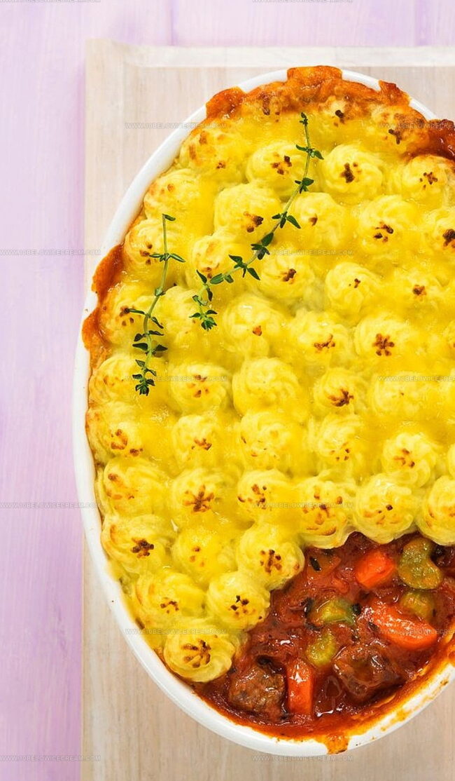 Creamy mashed potatoes crown this delectable dish with golden, crispy edges.